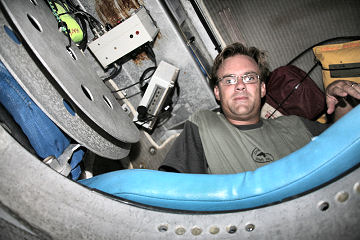 We come to rest at about 1,590 feet below the surface of the water. The pilot begins searching for the EITS camera system. He uses an underwater telephone system to communicate with the ship above. He tells the ship’s crew that we’re having trouble finding the system.