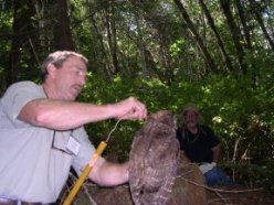 Diller skillfully pulled the owl to him and held it tight, grasping its feet in one hand and stroking its forehead with the other. The owl appeared to love that and relaxed completely. Any time it got antsy, all Diller had to do was stroke its forehead, and it quieted down. Diller took some measurements of the bird, then put a tag on its foot. All the while, the three other birds watched with interest.