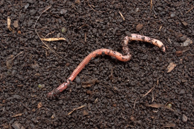 In the garden, earthworms (such as those seen here) can move biochar (a type of charcoal used in agriculture) to the root zone of plants. This can help tomato plants grow larger and better fight disease.
