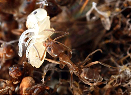 Ant nests have great undertaker capacity. Workers detect the dead and haul them outside to a pile of debris and corpses, often within an hour after death. Here a worker carries a young ant in the pupal stage to the refuse pile.