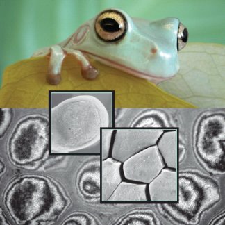 A tree frog’s toe pad (upper inset) consists of six-sided skin cells (lower inset) that are covered with cleat-like bumps (bottom). |