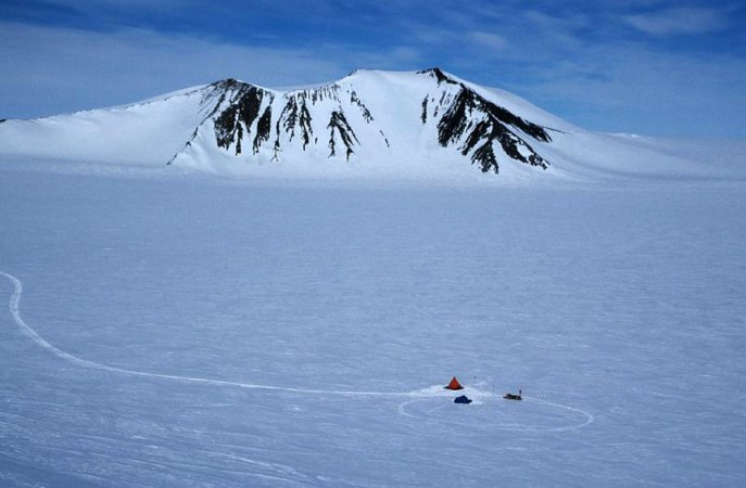 An isolated island of rock called Quilty Nunatak pokes its nose above the Antarctic Ice Sheet. Polar scientist Peter Convey stayed at the field camp in the foreground while collecting tiny creepy-crawlies from the rock.