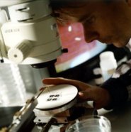 A researcher examines small samples of a full-color display that, on a larger scale, might eventually bring video to newspapers and magazines.