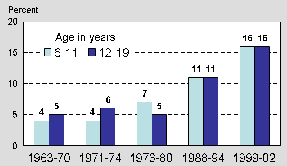 The following chart shows how the percentage of children who are overweight has increased since 1963. The chart gives information about children in two different age groups (6 to 11 and 12 to 19) in the United States.