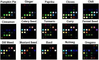 Each spice and herb has a distinctive smell and produces its own fingerprint of colored dots. |