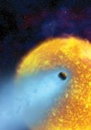 Artist’s depiction of a cometlike wind of hydrogen gas (blue) escaping from the outer atmosphere of the planet HD209458b, which tightly orbits its parent star (yellow).