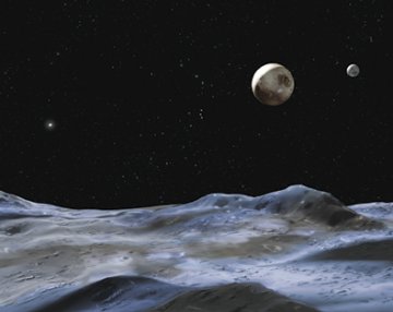 The imagined surface of one of the two newfound moons of Pluto shows the planet above the horizon. The previously known moon, Charon, lies to the right of the planet, and the other new moon is at the far left.