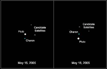 These two images from the Hubble Space Telescope show the positions of Pluto, Charon, and the two objects that may be additional moons of Pluto. The movements of these objects, shown three days apart, suggest that they orbit Pluto.