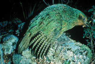 The kakapo parrot, which can weigh more than 1.5 kilograms, forages at night. The birds can live about 60 years.