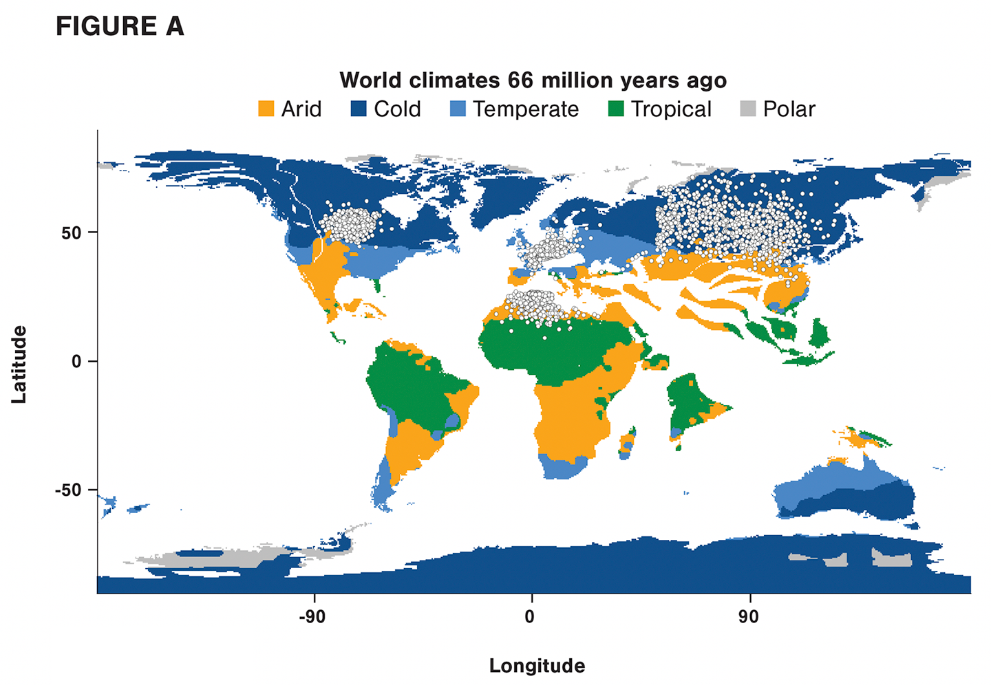 - Look at the locations where dots are clustered. What type of climate existed at each location 66 million years ago?