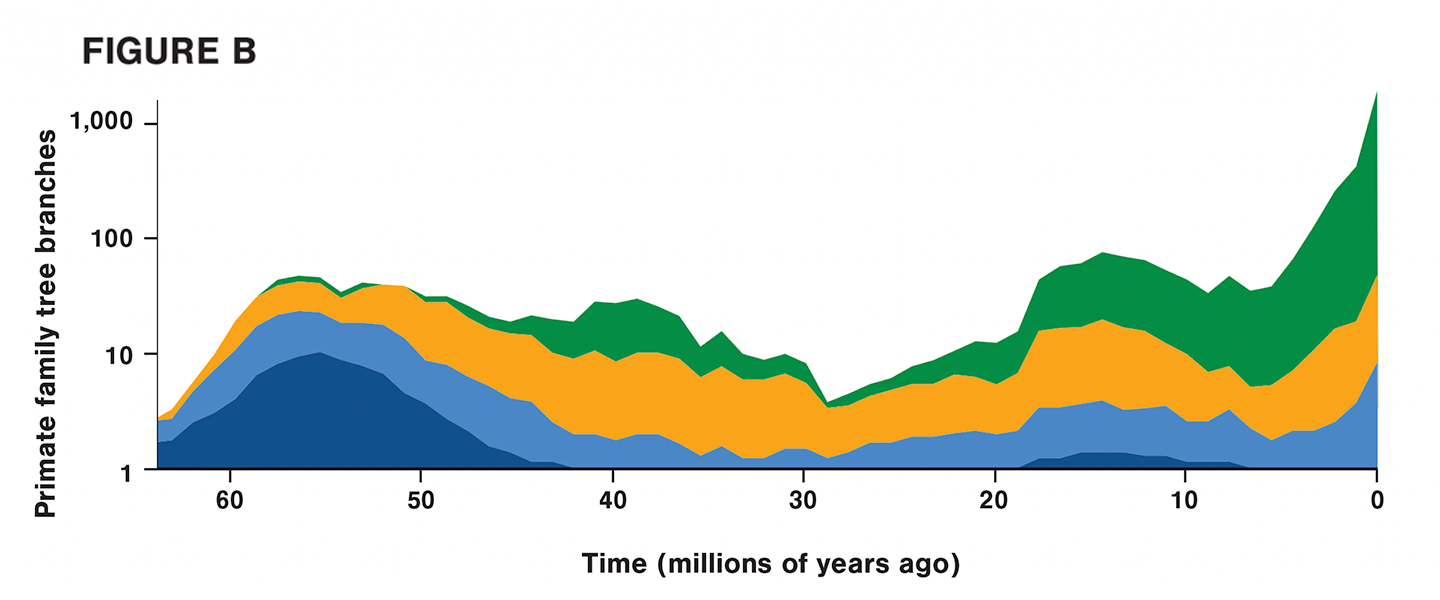 - Look at Figure B. How many primate family tree branches were there 66 million years ago? How are they spread between different types of environments?