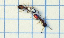 An ant (right, with red paint) that knows where food lies guides an inexperienced forager (left, dabbed with white), which keeps in touch with antenna taps. |