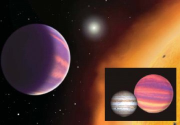 In this artist’s illustration, a newfound planet closely orbits a star that’s just 450 light-years from Earth. A partner star (top center) lies in the distance. The inset compares Jupiter (left) with the puffy planet, HAT-P-1b (right).