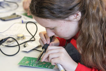 The students patiently soldered parts in place. Even so, the process was sometimes tricky. “Trying not to burn myself was really hard,” noted 13-year-old Isabella O’Brien of Canada.
