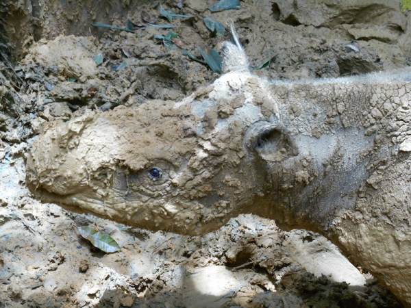 Imam, a female Sumatran rhinoceros, wallows in the mud to keep cool. The Borneo Rhino Alliance captured her from the wild. It is trying to help her have babies.