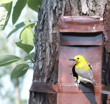 For a decade, researchers from the Illinois Natural History Survey in Champaign and the Florida Museum of Natural History in Gainesville have been monitoring warbler nests in boxes in southern Illinois. During that time, they often saw cowbird eggs in the warbler nests. The nest boxes sit on poles that the scientists have covered with grease to protect the eggs and chicks from raccoons, snakes, and other predators.