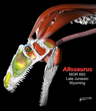 Compared to tyrannosaurs like the infamous T. rex, Allosaurus had smaller muscles in its jaw but larger ones in its neck. Those muscles also attached low on the neck, relatively close to the shoulders.