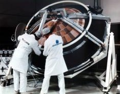 Technicians working on the Huygens probe before its launch together with the Cassini spacecraft.