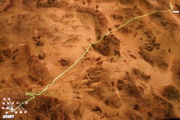 The race’s route (yellow line) took self-controlled vehicles across rough desert terrain between Barstow, Calif., and Primm, Nev. The squares near the starting point mark how far various vehicles went before failing in their attempt to navigate the route. |