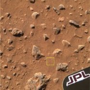 The square marks the first patch of Martian soil examined by the rover Spirit.