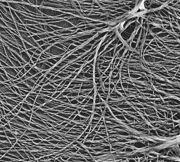 Scientists found this ancient mat of tiny, threadlike cellulose fibers in 253-million-year-old salt deposits deep below the New Mexican desert. Each of the cellulose fibers, shown here through a microscope, measures between 5 and 16 nanometers (a human hair is about 80,000 nanometers wide).
