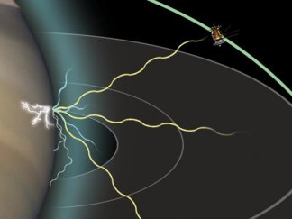 This illustration shows how lightning above Saturn would generate high-frequency radio waves that could be detected by the Cassini spacecraft.