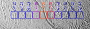 The southern polar region of Enceladus has long, deep cracks. The temperature (measured in kelvins) is higher directly over such cracks. The number above each colored box is the average temperature of the area within the box. The temperature inside the narrow crack itself (cutting across middle box) may be as high as 145 kelvins (about –200 degrees Fahrenheit or –130 degrees Celsius). |
