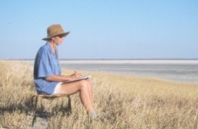 Artist Alison Nicholls sketches in the Makgadikgadi Salt Pans of Botswana. |