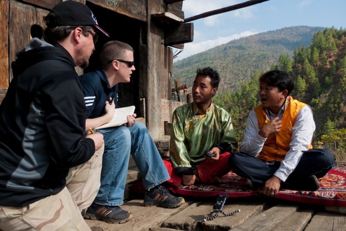 Greg Anderson and David Harrison, on the left, traveled to India to document a language — Sherdukpen — which is not written down. The researchers interviewed native speakers Dorji Khandu Thongdok and Lamu Norbu, on the right. Norbu says this language “is important for our identity.”