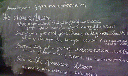 Written on this chalkboard are alternating phrases in English and their translations into Anishinaabemowin. Margaret Noodin teaches students to communicate in this language. Only about 8,000 people still speak it. Margaret Noodin / Ojibwe.net