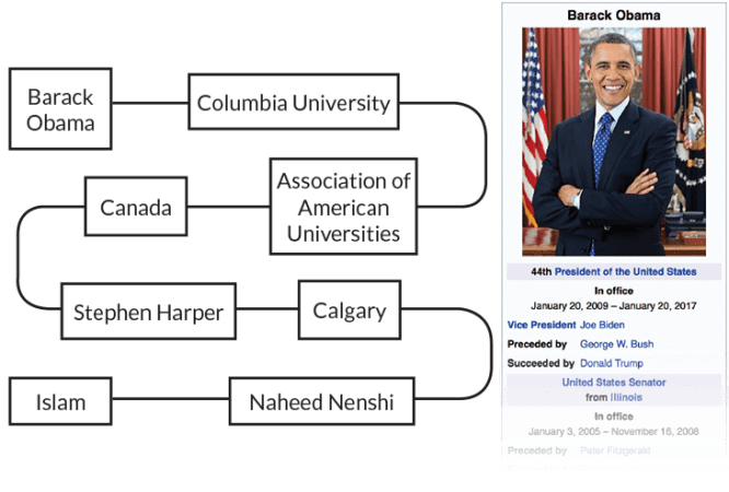 An automated fact-checker judges the assertion “Barack Obama is a Muslim” by studying degrees of separation between the words “Obama” and “Islam” in a noun network built from Wikipedia info. The very loose connection between these two nouns suggests the statement is false.