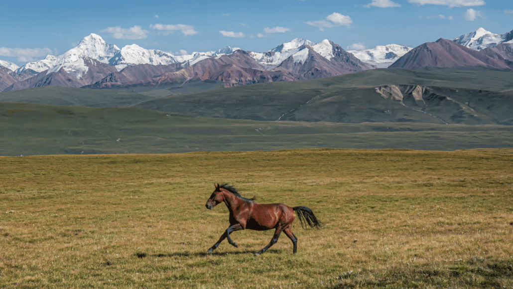 Here, a horse runs through the steppe of Kyrgyzstan with Tien Shan mountains in the background.