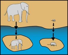 Large animals, such as elephants, may become smaller when isolated on islands. In contrast, relatively small animals, such as shrews, sometimes evolve into larger species.