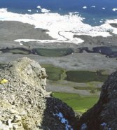 The high cliffs of Devon Island in the Canadian Arctic house seabirds known as northern fulmars. Droppings from these birds fertilize the green ponds below the cliffs and dose the ponds with mercury, pesticides, and other pollutants.