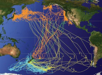 This map shows the travels of 19 sooty shearwaters during breeding and migration. Their tracks during breeding, near New Zealand, are shown in light blue. Yellow pathways represent their northward migratory routes. Orange lines show the birds’ wintering a
