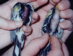 A blackpoll warbler (right) gets much fatter than other birds, such as the yellow-rumped warbler on the left, that migrate much shorter distances.
