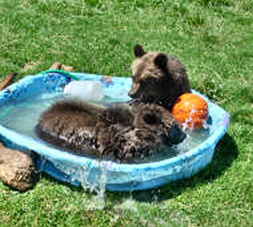 Two grizzly cubs play in a pool at the WSU Bear Center.