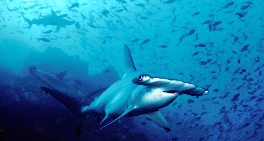 Fitted with special sensors, hammerhead sharks (like the one seen here) can collect valuable data as they take deep nightly dives and long trips through the Pacific. Those data will help the computer programs used to predict weather and climate.