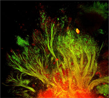 Of course, cities of bacteria can’t erect actual buildings. Instead, they extend little hairs called pili and use them to grab onto a surface. Then, they produce a sticky, slimy net called an extracellular matrix. It holds the biofilm together and helps fortify it. Inside, many species live together. Each has a special job. By working as a team, they keep the biofilm strong.