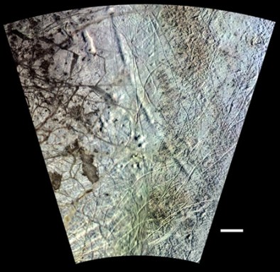 These deep depressions on Europa indicate the moon’s icy surface slid 80 degrees, shifting the polar regions toward the equator. |