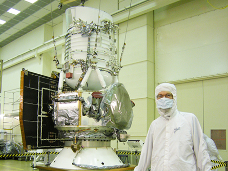 Wide-field Infrared Survey Explorer project scientist Peter Eisenhardt stands next to the fully assembled satellite.