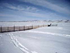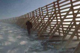 This type of snow fence, commonly found in Wyoming, is used to control drifting and blowing snow. Such fences can be up to 14 feet tall. |