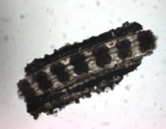 This glassy fragment (about 100 micrometers long) was extracted from fossilized dinosaur dung unearthed in India. Its presence shows that the reptiles dined on grass. |