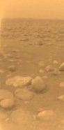 The Huygens probe landed on Titan in a field of rocks and pebbles. The large object just below the middle of the image is about 15 centimeters (about 6 inches) across. The surface appears to consist of a mixture of water ice and hydrocarbon ice.