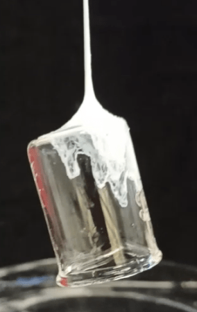 It’s the first adhesive that can stick to and lift things from a distance, its developers say. The new material shoots out of a syringe. It emerges as a liquid, then quickly hardens into a strong thread. And it sticks to almost anything it touches.