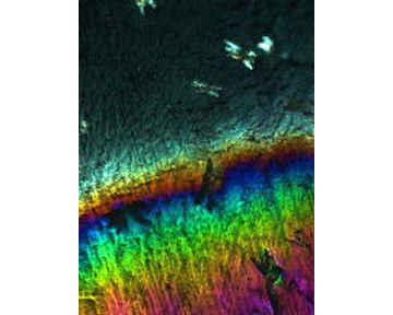 This microscopic picture shows what happens when a synthetic material that’s like silk gets stretched. The stretched part of the material is near the bottom of this picture. It appears to be brightly colored because the molecules are lined up. |