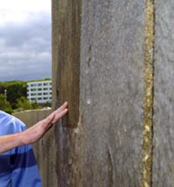 One of the supergoo mixes has been sprayed onto a wall. The goo remains moist to the touch for hours, until cleanup crews are ready to vacuum it off – along with any radioactive debris its sucked in – for safe disposal. |
