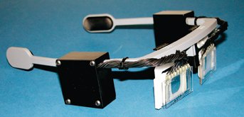 Electric signals from microchips in the black boxes attached to these experimental eyeglasses change the focus setting to improve vision.