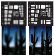 An image is out of focus when a special, electrically controlled lens is off (left) but clear when the lens is on (right).