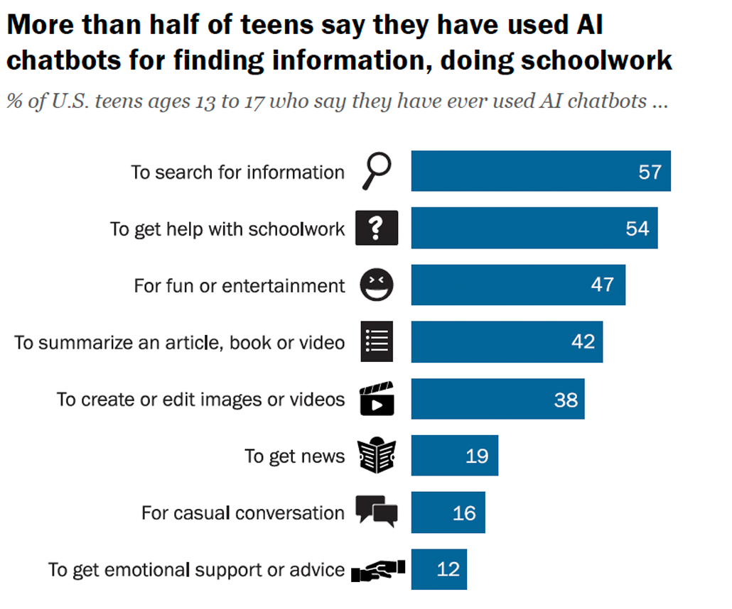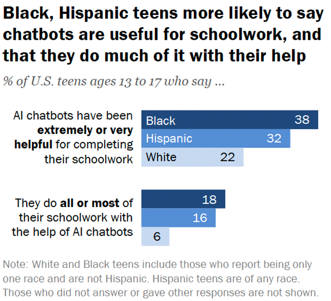 More than half of U.S. teens use chatbots for homework. Of these, at least one in five say they use it for all or most of their schoolwork. Black and Hispanic teens are more likely than white teens to use it for school — and to find it helpful.